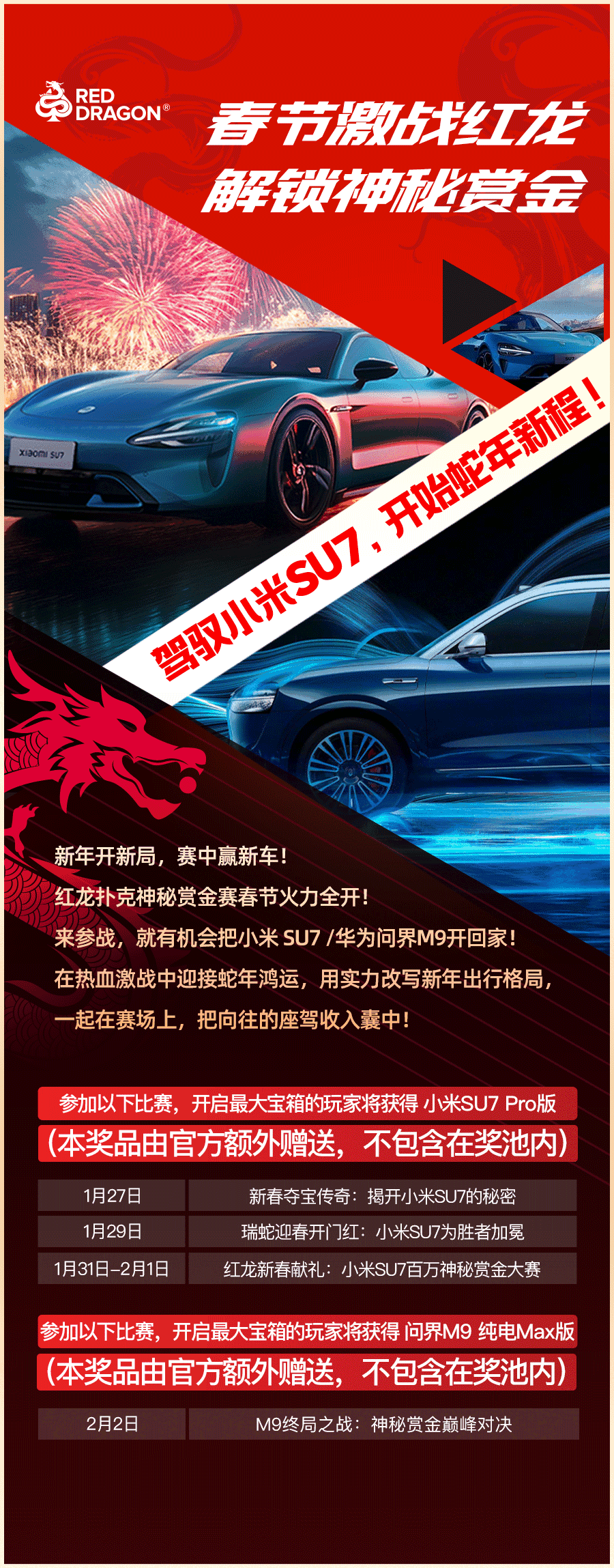 春节是每年新的起点,也许你正计划与家人团聚,享受温馨的节日时光,但今年春节,或许你将迎来一次不同寻常的突破:在红龙扑克的赛场上,一场热血激战等着你,在这里不仅可以赢得丰厚大奖,还能获得令中国人骄傲的电动汽车:小米SU7和华为问界M9!