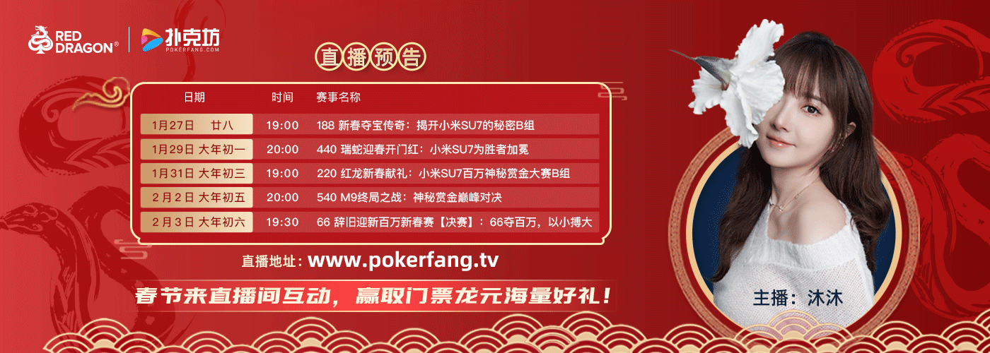 在蛇舞龙腾新春狂欢七天乐期间,电竞女神沐沐将携手扑克坊(pokerfang.tv)为大家带来精彩直播!