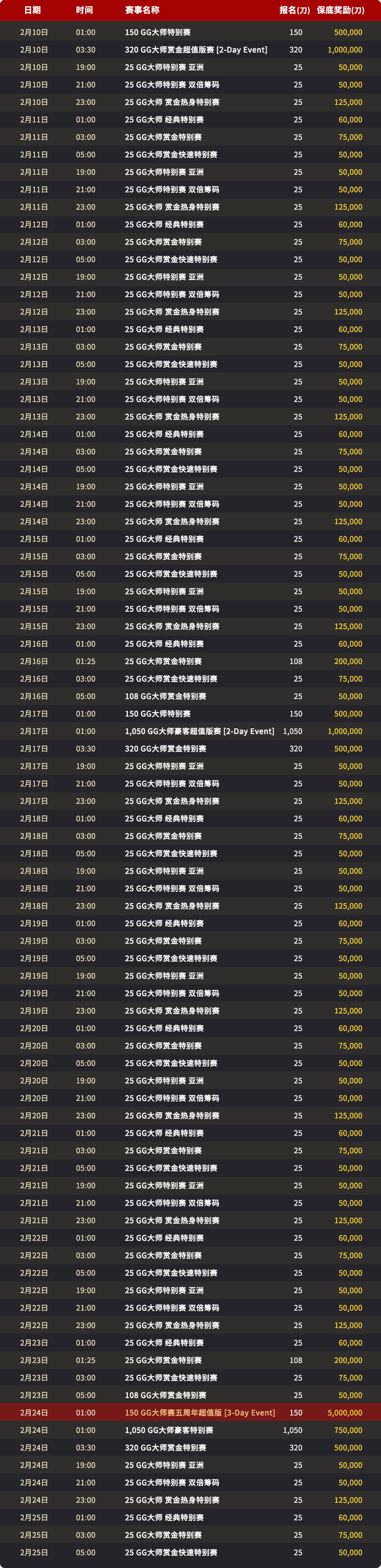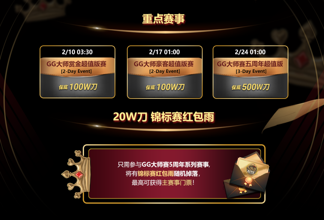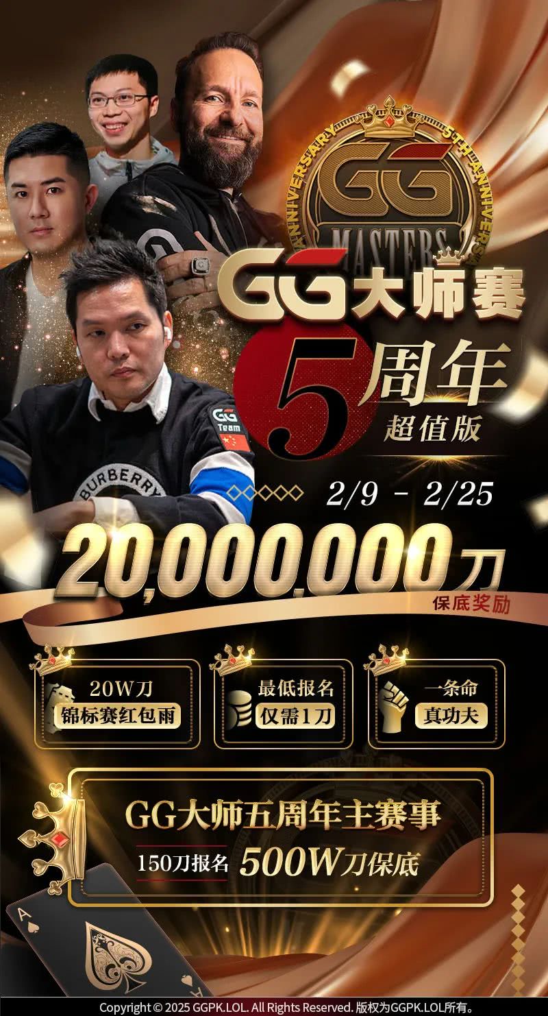 今年2月9日-2月25日,GG大师赛5周年超值版迎来史无前例的挑战——150刀报名主赛事,仅此一场,2月24日凌晨01:00,保底5,000,000刀!