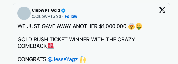 ClubWPT 发布了一条祝贺Yaginum赢得奖金的声明;