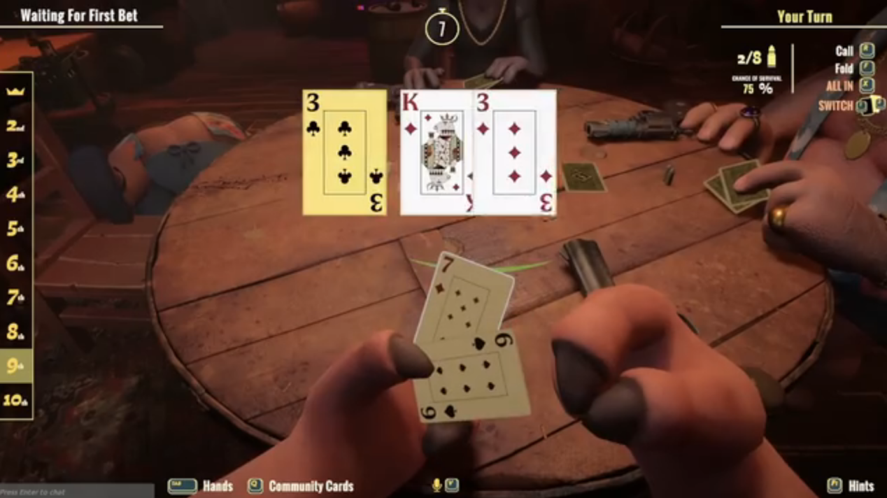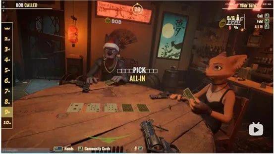 他们试图将德州扑克里的心理博弈与游戏中“轮盘赌一枪定生死”的风险机制做一次创意融合。