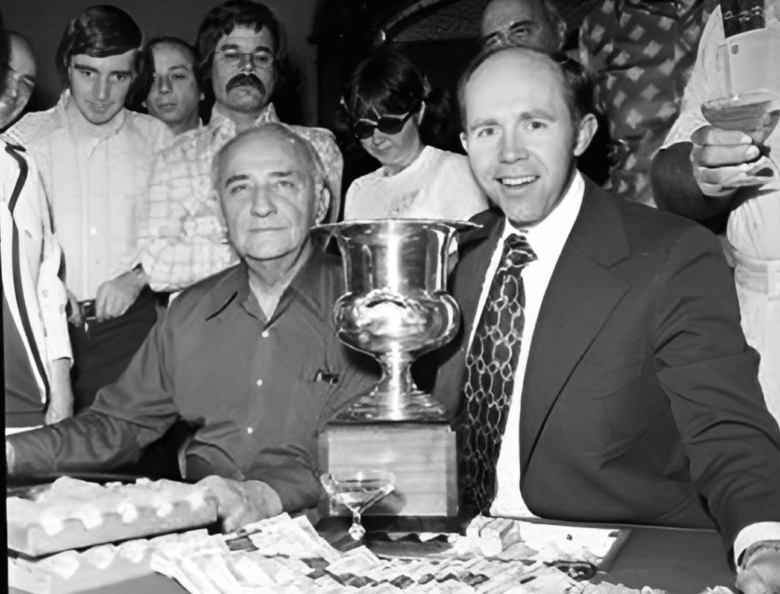 Johnny Moss胜出后,举起象征荣誉的银杯。