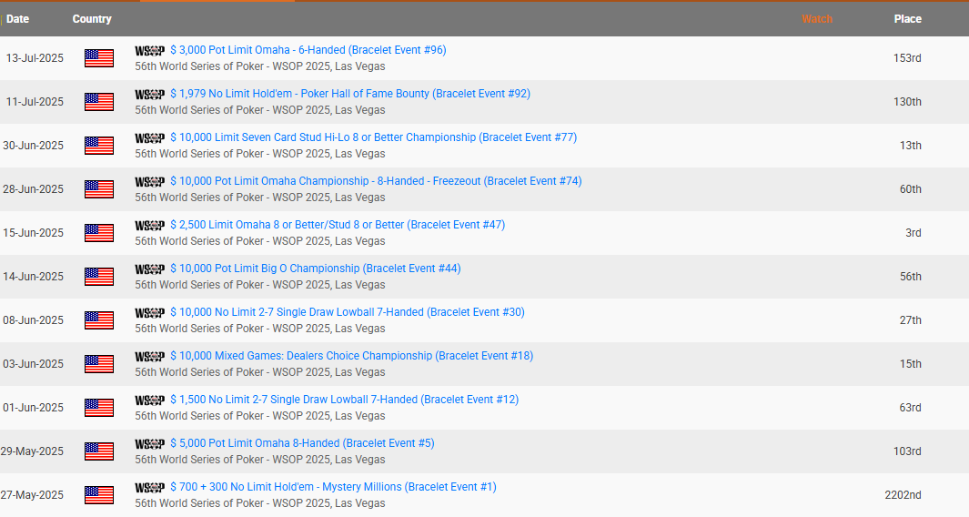 虽然今年没有金手链入账,但他却11次进入奖励圈,刷新了自己的奖励圈记录。现在他以225次奖励圈次数排在第34名。第一名是乌克兰选手Arkadiy Tsinis的543次。
