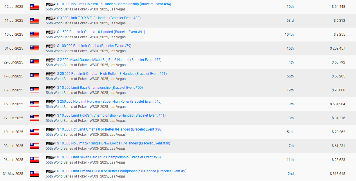 在本次系列赛中,Hellmuth仅打入决赛桌一次。他在赛事47:$2.5K限注奥马哈8+/梭哈8+混合赛中获得第3名。