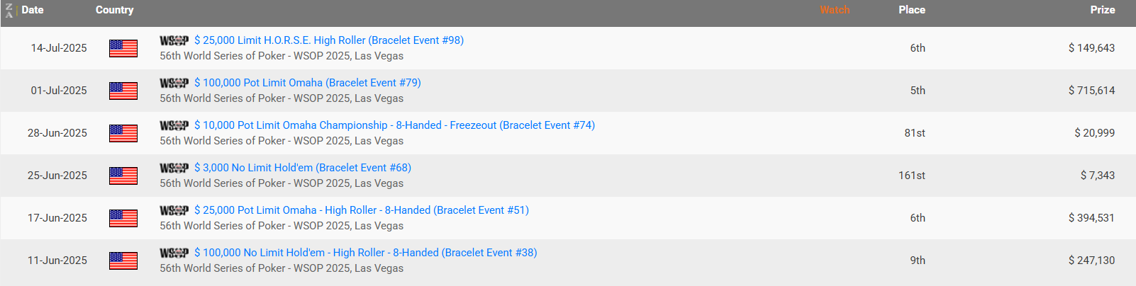 赛事51:$25K底池限注奥马豪客赛(8人桌),第6名
