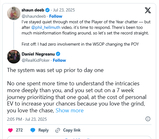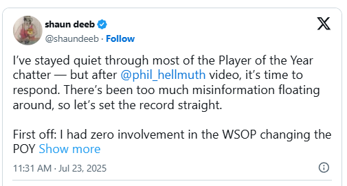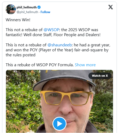 "赢家就是赢家!这不是对@WSOP的指责:2025年WSOP办得棒极了!致敬所有工作人员、裁判和发牌员!这也不是对@shaundeeb的否定:他今年表现优异,完全按照公布的规则公平赢得了年度玩家(POY)。这是对WSOP年度玩家积分制度的质疑。"