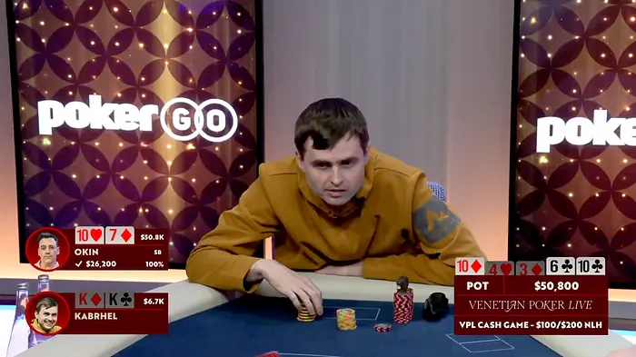两人说好发牌一次。河牌发出10♣,Kabrhel被河杀。他突然变得异常沉默,Okin收走50,800的底池。