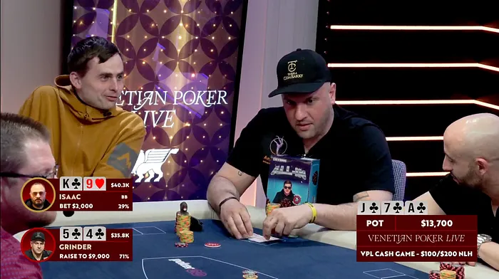 这是当时最大的底池。Mizrachi用5♣4♣加注到1K,Isaac在大盲位用K♣9♥捍卫盲注。JRB弃掉400的straddle。两人单挑看翻牌。
