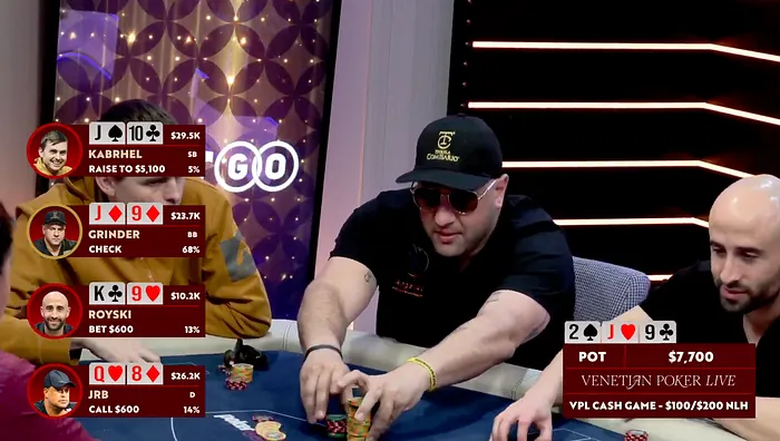 翻牌是2♠J♥9♣,Kabrhel在小盲位拿着J♥10♣,选择过牌。Grinder在大盲位拿着J♦9♦,他也过牌。Royski拿着K♣9♥,他拿到中对,下注600。JRB的牌是Q♥8♦,在按钮位用卡顺听牌跟注。接着Kabrhel过牌-加注到5,100。Grinder全下23,700,其他两人弃牌。