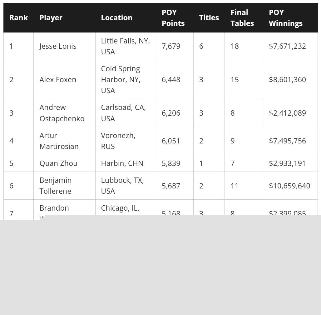 Jesse Lonis是过去18个月中战绩最辉煌的牌手之一,他目前不仅在一个,而是在两个主要排行榜上领跑。他目前高居CardPlayer年度牌手榜榜首: