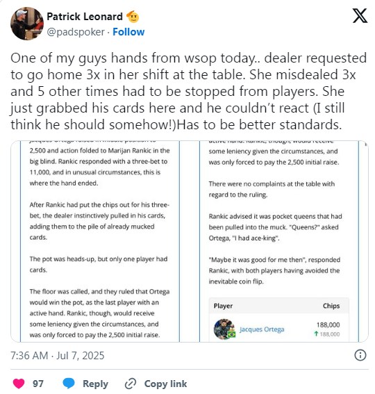“这不是比赛,是灾难!WSOP发牌员能不能别乱来?!”