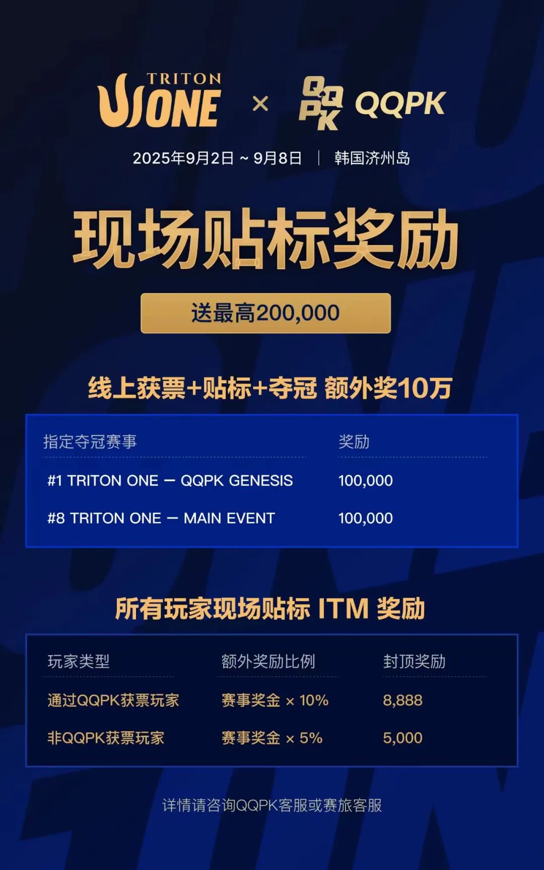 全球瞩目的扑克盛会Triton ONE首站系列赛将于2025年9月2日至8日正式登陆济州岛!在QQPK官宣成为triton one首站冠名赞助商后,Triton Poker Series首席执行官Andy Wong表示:“我们非常高兴正式宣布QQPK成为Triton ONE的冠名合作伙伴。我们的使命是让更多玩家有机会接触并热爱这项运动,而此次合作将Triton ONE推向成千上万的线上玩家,极大拓展了我们的触达范围。”