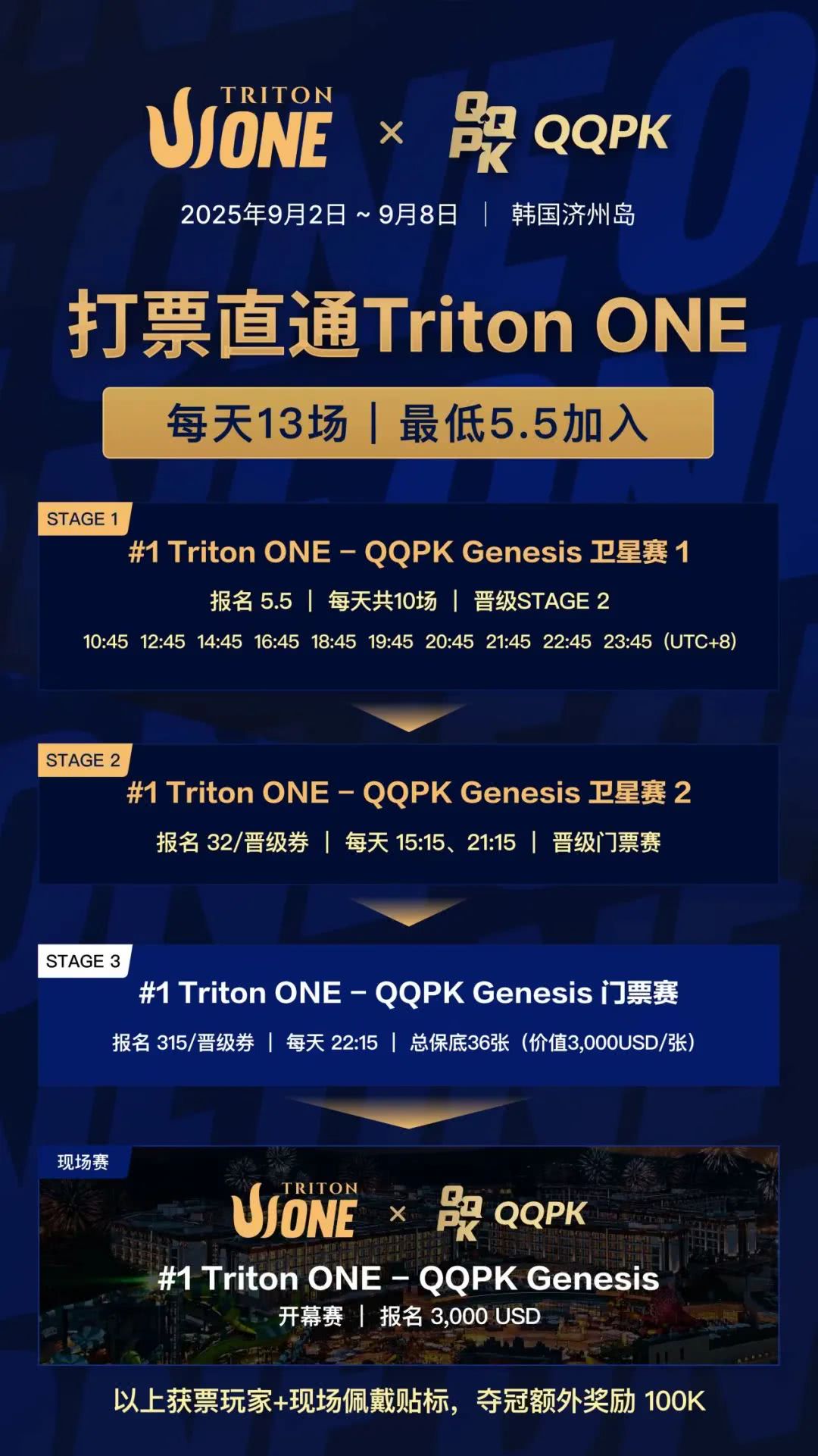 QQPK所独家开启的Triton ONE门票卫星赛是一场为无数玩家铺设晋级之路的旅程,为每一位有梦想的玩家铺设出通往传奇的阶梯。从亲民入场门槛起步,透过实力与策略逐级晋升,最终登上TritonONE的聚光舞台。