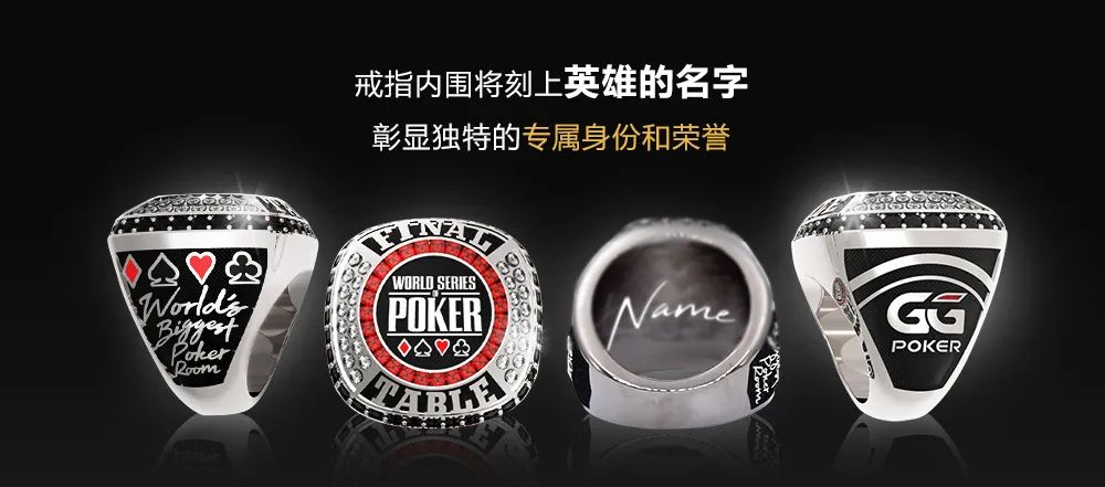 戒指表面镶嵌着近百颗珍贵宝石,绚烂夺目;两侧字样记录了你于世上最大的扑克舞台成功留名;内围则精心刻上每位英雄之名,彰显独特身份。