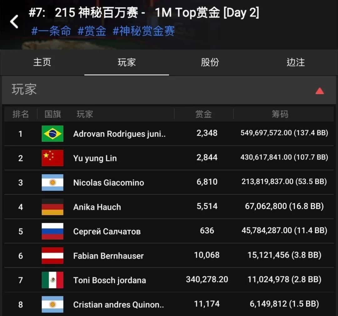 紧随其后的则是中国台湾选手Yu Yung Lin,手握107.7BB。这位2023年才开始于The Hendon Mob留下现场战绩的年轻选手,如今正迎来自己生涯最重要的一战。
