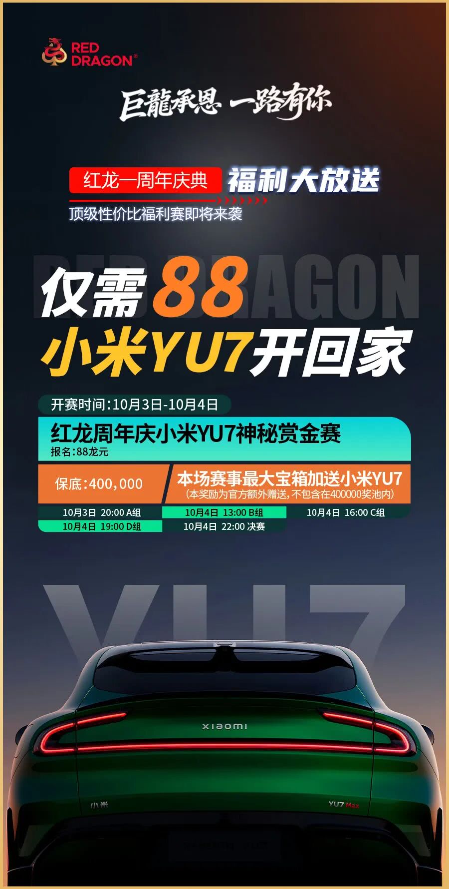 10月3日至4日。总奖池40万龙元、本场赛事的最大宝箱奖品正是一辆全新小米YU7!一辆车的钥匙可能就握在你手中。