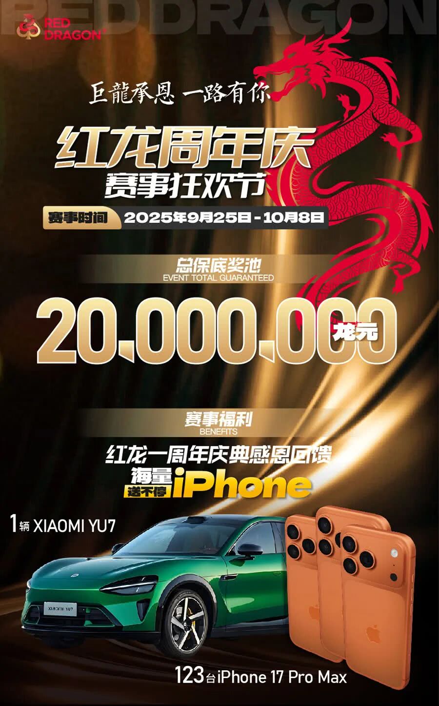 以“感恩回馈,海量豪礼”为主题,赛事总保底奖池高达 2000万龙元,并准备了超豪华的福利:123台iPhone 17 Pro Max 与 小米YU7一辆,总有一份属于你!