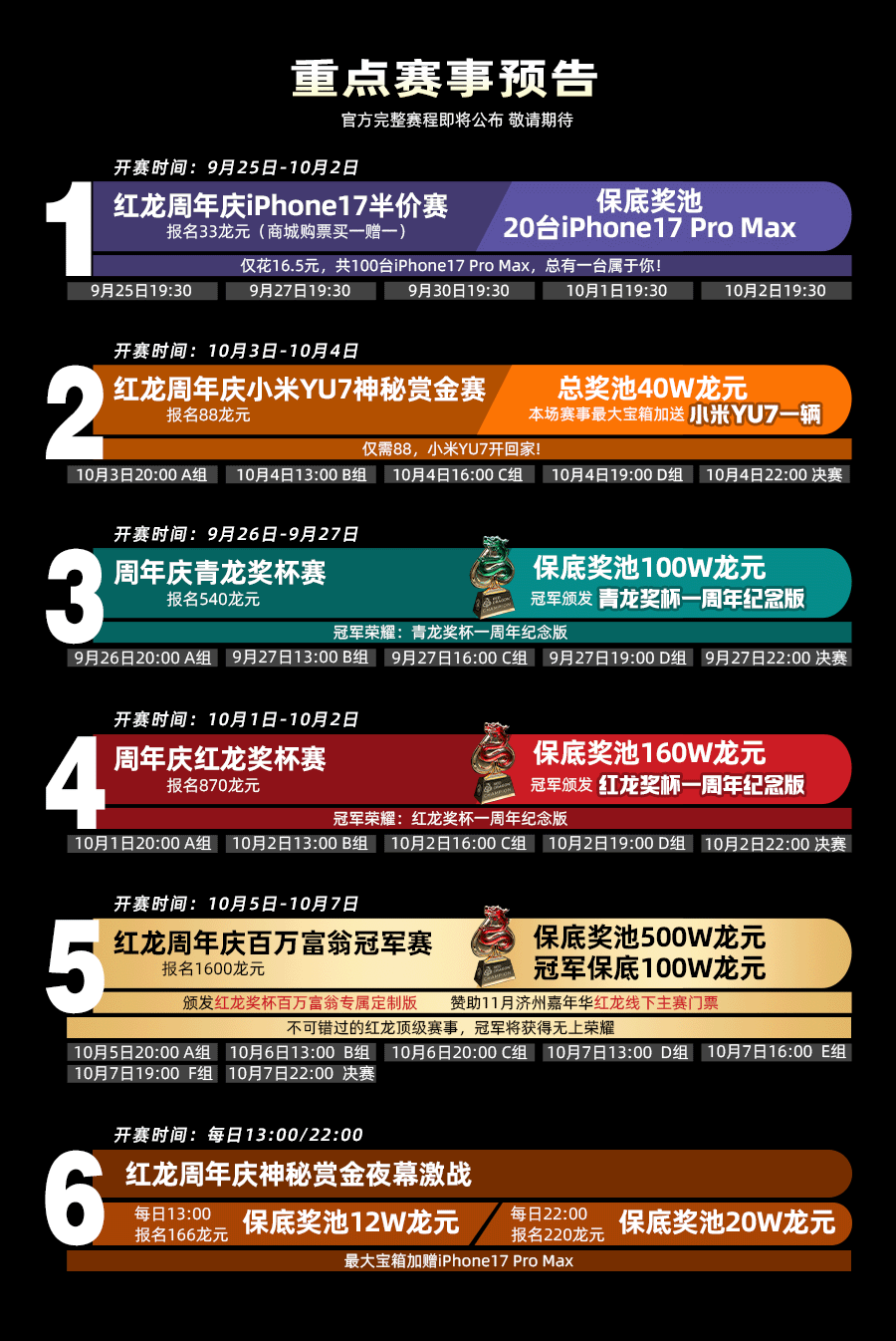 官方完整赛程即将发布,但热度已提前拉满。红龙一周年,不只是庆典,更是一次和兄弟们共同追逐荣耀、豪礼和梦想的机会。