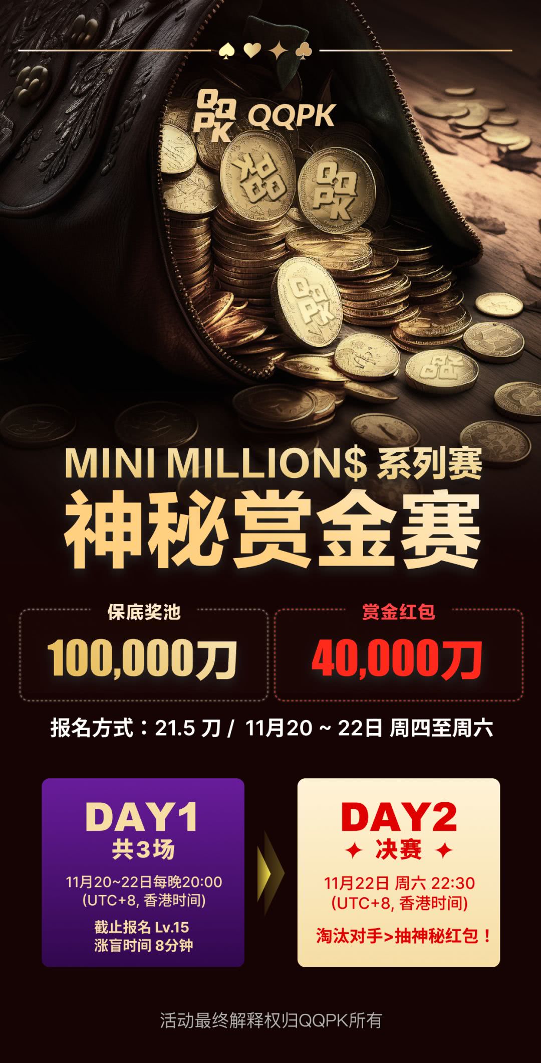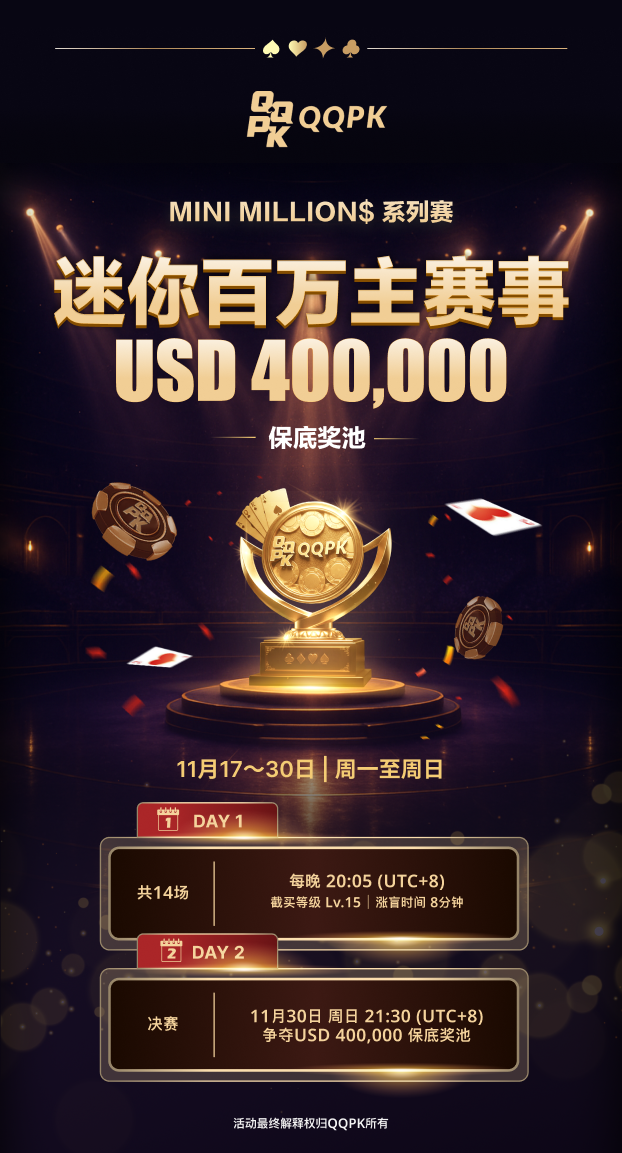 而这个十一月,QQPK为每一位热爱扑克的你,准备了一场融合个人技术与团队荣耀的扑克狂欢——总奖池叠加超过120万刀,等你来挑战!