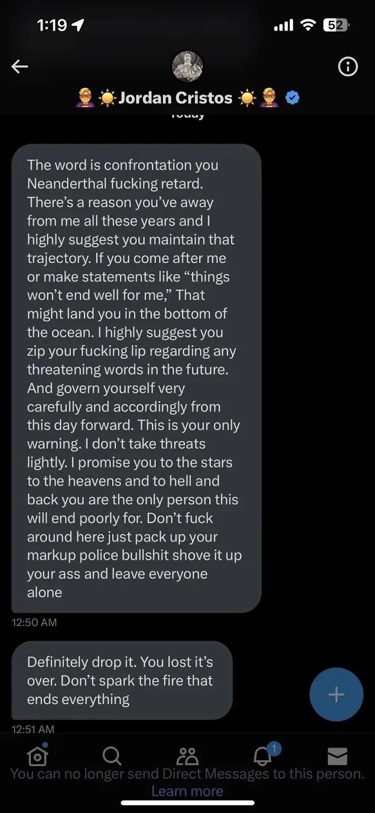 2025年9月15日,Jordan Cristos因向家庭法官Regina McConnell发送威胁电子邮件和评论而认罪。McConnell法官当时正在处理他的子女监护案件,显然她的裁决激怒了Jordan。