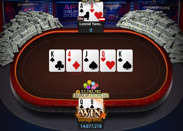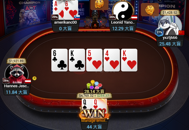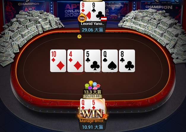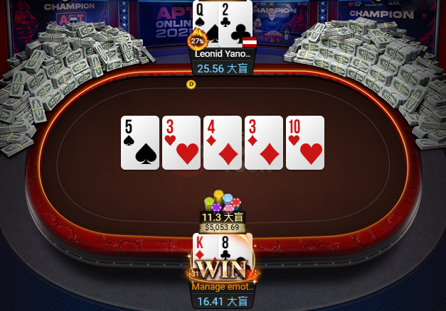 紧接着,Lin Jinyue的Q9s击败对手A9o,成为这场APT收官赛战到最后的男人。