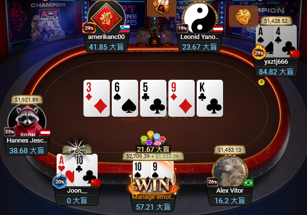赏金赛让比赛的节奏异常紧张刺激。FT第一手牌,yxztj666手持口袋8,凭着河底中顺击败巴西选手Alex Vitor的顶对J,扩大领先优势。
