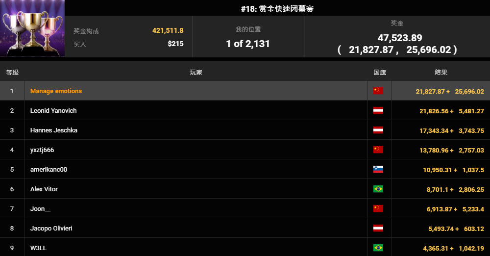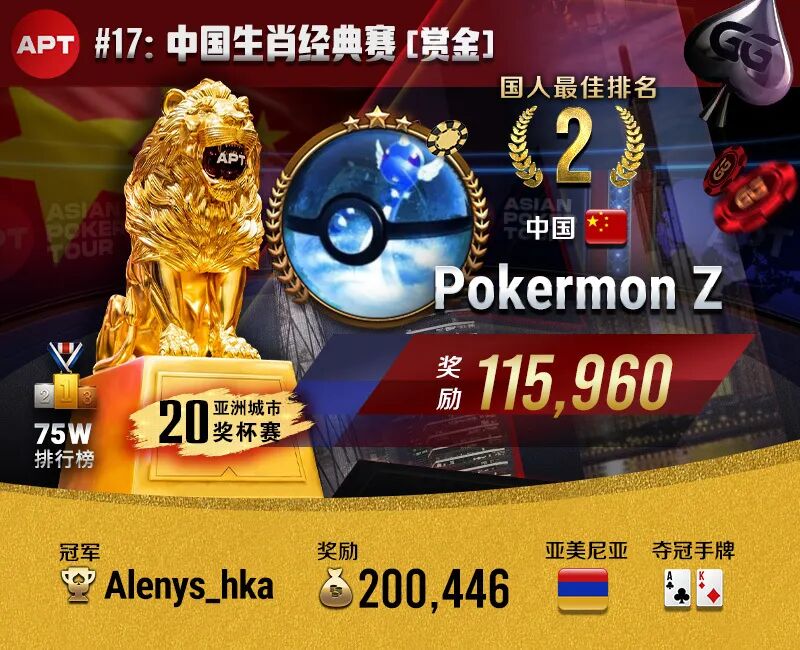▌Zhong Yurui(昵称Pokermon Z)斩获#17:中国生肖经典赛亚军,奖励115,960。