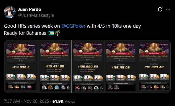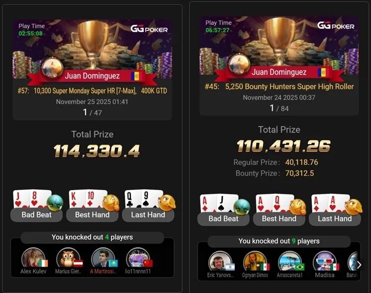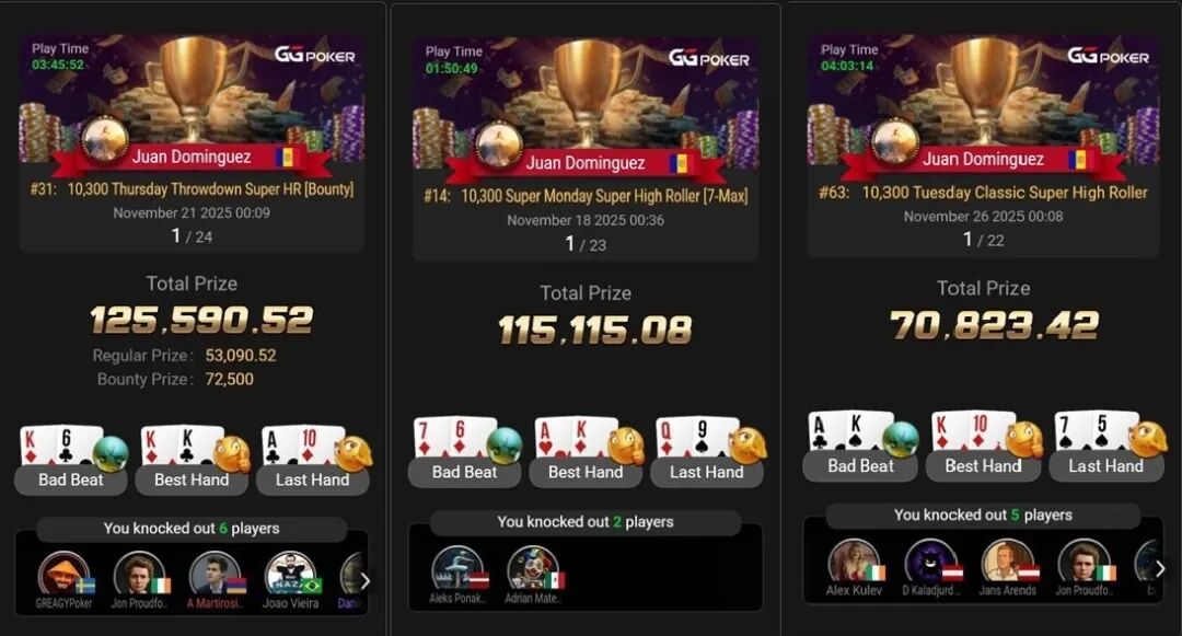 过去一周,他在GGPoker打出了近乎夸张的统治级表现:连续拿下五场5K与10K豪客赛冠军!