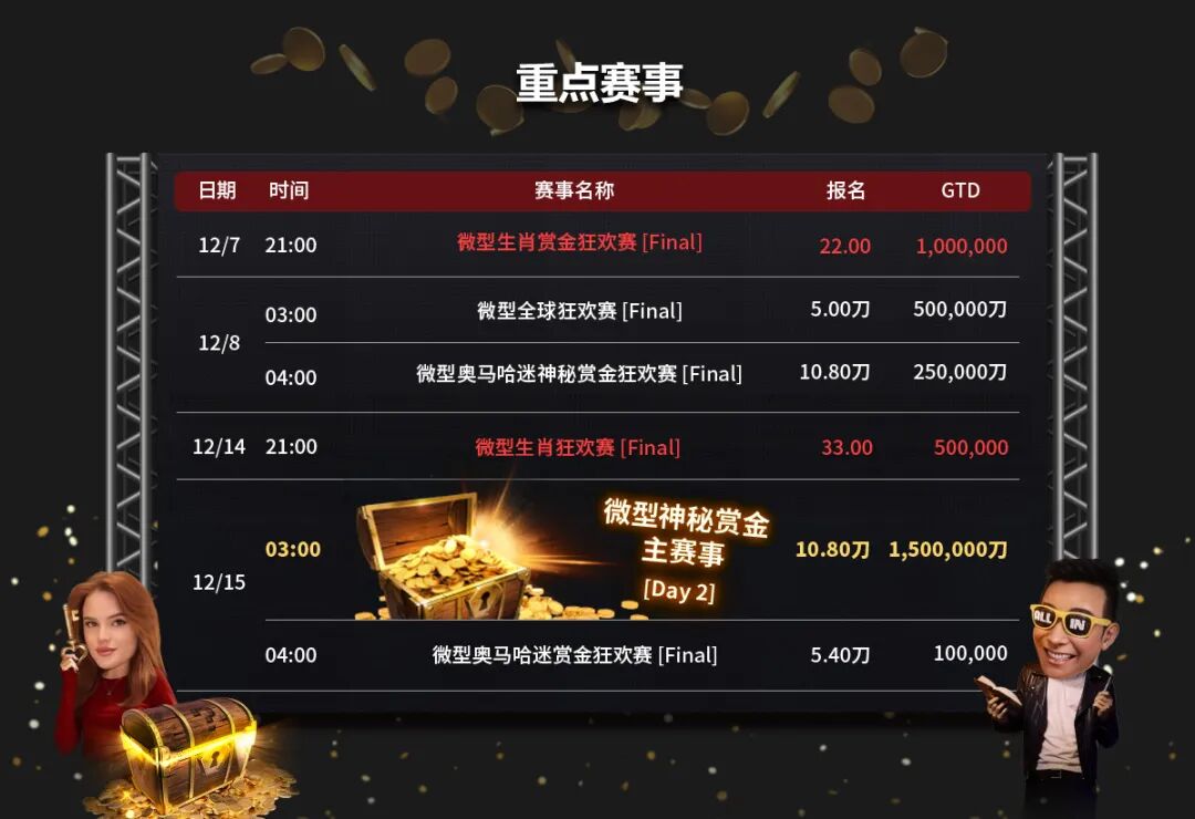 《GG微型狂欢赛》报名最低从1刀起步,但奖励却是丰厚得惊人。其中包含德州、奥马哈、赏金制和人气爆棚的神秘赏金赛,适合新手试水,也适合高手练习。