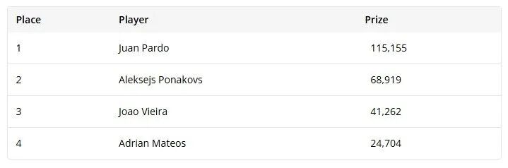 Pardo的第一场胜利来自#14:10,300周一超级豪客赛[7人桌]。该赛事只有23位参赛者、4人前圈,全部都是未来将在巴哈马WSOP天堂岛再度碰头的强敌:Aleksejs Ponakovs、Joao Vieira、Adrian Mateos。