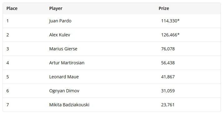 Kulev虽在双方单挑协议里获得较多奖励,但Pardo两次都在最后阶段将所有记分牌收入囊中,连续夺冠。遇到Pardo的Kulev几乎只能摇头苦笑,就问谁挡得住这种状态?