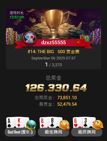 才刚夺下WSOP金手链,三天后又再打进另一场决赛桌,这状态简直绝了!北京时间9月6日,中国选手Kun Liu(昵称dzxz55555)从3,370人次中脱颖而出,勇夺GGPoker线上WSOP#14: THE BIG 500赏金赛冠军。而当刚刚捧起生涯首条金手链的喜悦还未散去,想不到9月9日,他继续杀进#17:百万创富赛最终九强,手感之火热。这样的势头,已经...