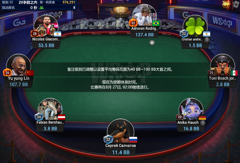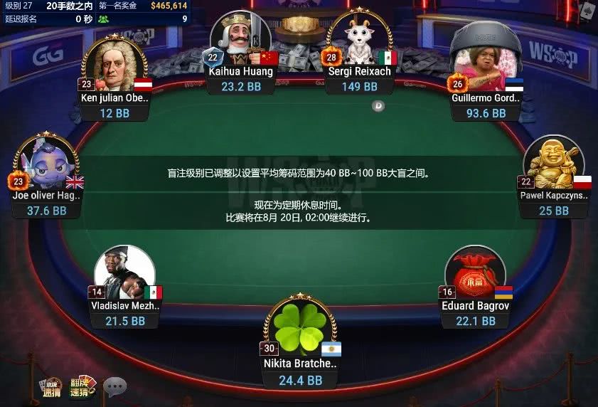 2025年《GGPoker WSOP线上金手链系列赛》正在火热进行中。北京时间8月19日凌晨02:00,赛事#2:$300扑克角斗士赛经过近7小时鏖战后,FT九强正式诞生,同时传来令人振奋的好消息——中国选手黄凯华 (Kaihua Huang)成功闯入决赛桌!目前他以18,552,176的记分牌 (23.2BB)暂居第六位,虽然与CL西班牙名将Sergi R...